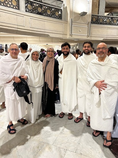 We joined the thousands of people doing tawaf, walking around the Kaaba seven times reciting prayers. Everyone is in a state of physical and spiritual purity, ihram, dressed in simple garb—for men, two pieces of white cloth; for women, modest clothing. This symbolizes that we are all equal before God. I tried to recite from the Arabic prayer booklet around my neck, but it was impossible to read in such a mass of people—there were large groups walking together arms locked, parents carrying children on their shoulders, people pushing closer to the Kaaba’s black stone lost fervently in prayer. I held onto Arif’s arm and prayed from my heart—every wish, every anguish I could think of; prayers of gratitude and for forgiveness; prayers for family and friends; prayers that many of you shared with me; prayers for Palestine; prayers to end all people’s suffering. When we completed seven rounds (tracking on my ring counter) and moved out of the circle, others joined in. And so it continues. As it has for centuries, as it will for centuries.
