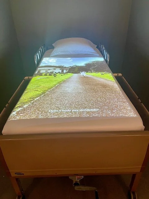 There was a particular installation that Arif and I continue to talk about. It shows a video of Suleika in a cemetery picking up hospital bills and medical records that are flying in the wind; the video is projected onto a hospital bed, and Suleika is reciting the dollar cost of her cancer treatment, and then posing the following questions:
